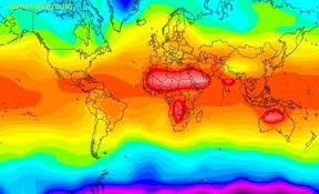 Distribución de temperatura a nivel planetario:estuvimos hablando que la distribución de la temperatura NO es uniforme en todo el planeta a causa de que la radiación solar no llega de la misma manera en los polos que en la zona ecuatorial... acá tienen un planisferio que demuestra la intensidad del calor en escala cromática... donde el color rojo es ALTA TEMPERATURA y el azul es BAJA TEMPERATURA